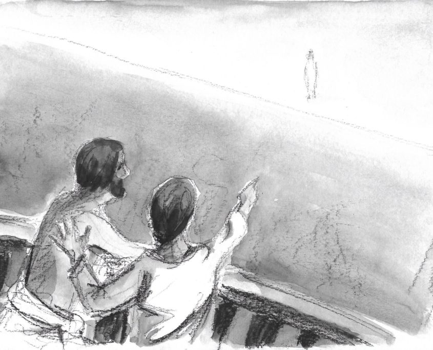 Pedro corre hasta la barca y ayuda a izar la red. Mete la mano en el montón de peces zigzagueantes y agarra tres de ellos, grandes. Los golpea contra el borde de la barca, para matarlos, y los vacía con su cuchillo. Pero le tiemblan las manos. Los enjuaga, los lleva a donde está el fuego, los coloca encima y vigila cómo se asan. Los otros están adorando al Señor, un poco separados, temerosos ante su imponente Presencia, como siempre tras la Resurrección.