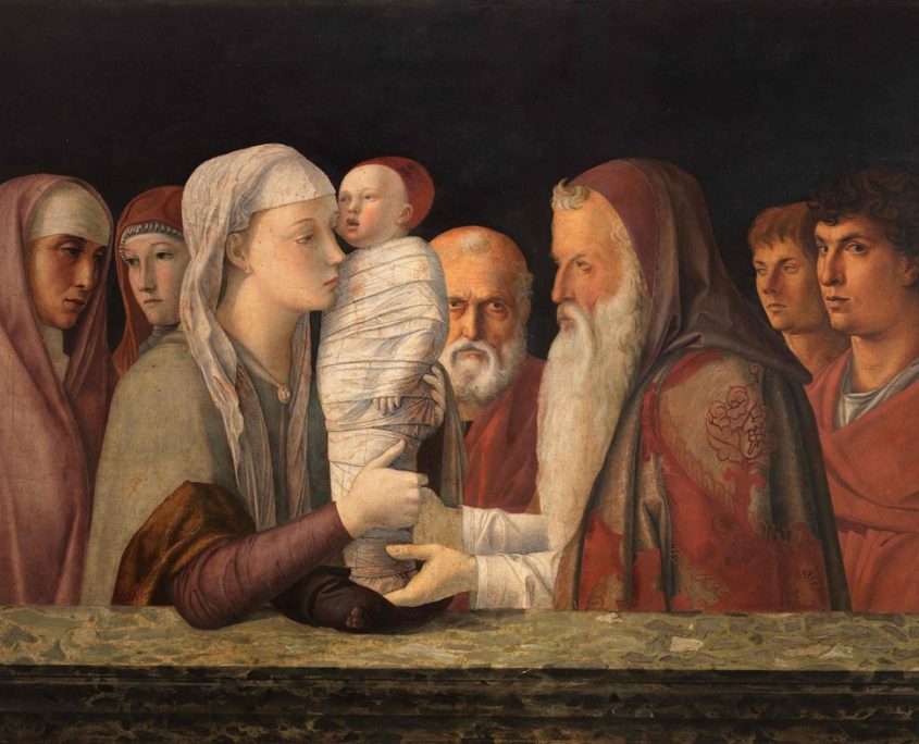 Oigo las palabras del santo anciano y veo la mirada de asombro de José, la mirada emocionada de María, y las de la pequeña multitud (quién se muestra asombrado y emocionado, quién, al oír las palabras del anciano, ríe irónicamente). Entre éstos hay algún barbudo y pomposo miembro del Sanedrín, y menean la cabeza mirando a Simeón con irónica piedad. Deben pensar que ha perdido la razón por la edad.